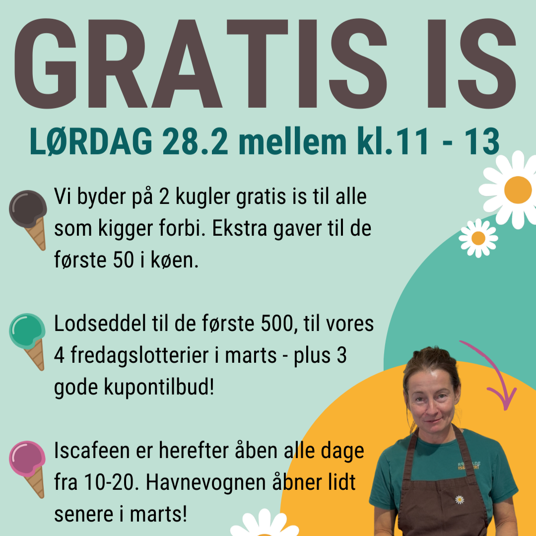 Lørdag den 28. februar åbner vi iscafeen og kickstarter foråret med at dele 2 kugler gratis is ud til alle som kigger forbi i tidsrummet mellem kl. 11-13.
